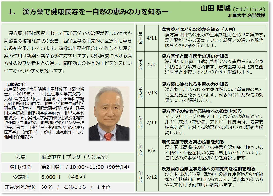 | 1 | 漢方薬で健康長寿をー自然の恵みの力を知るー | 山田 陽城 北里大学名誉教授 |