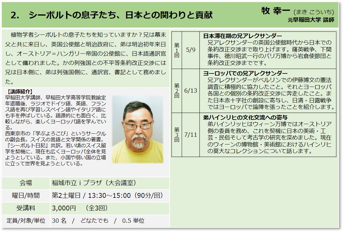 | 2 | シーボルトの息子たち、日本との関わりと貢献 | 牧 幸一 元早稲田大学講師 |