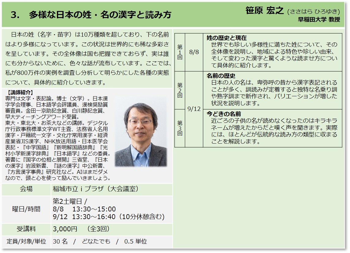 | 3 | 多様な日本の姓・名の漢字と読み方 | 笹原 宏之 早稲田大学教授 |