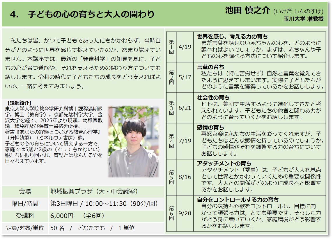 | 4 | 子どもの心の育ちと大人の関わり | 池田 慎之介 玉川大学准教授 |