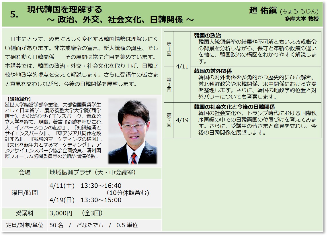 | 5 | 現代韓国を理解する ~政治、外交、社会文化、日韓関係~ |