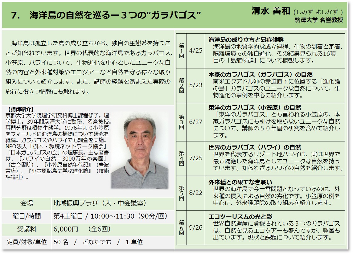 | 7 | 海洋島の自然を巡るー3つの“ガラパゴス” | 清水 善和 駒澤大学名誉教授 |