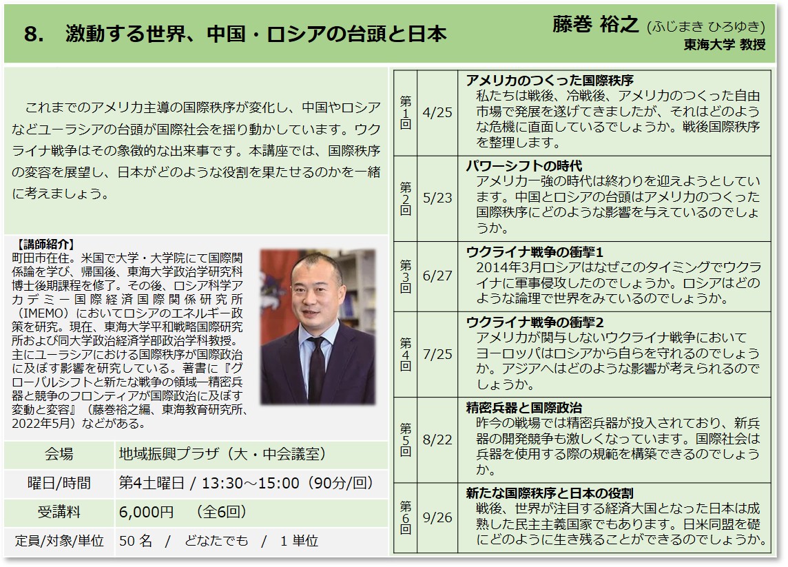 | 8 | 激動する世界、中国・ロシアの台頭と日本 | 藤巻 裕之 東海大学教授 |